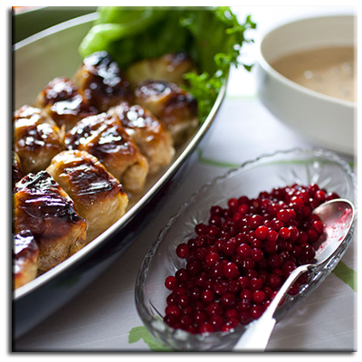 pots, in thei skins,until just cooked. Let cool, peel and chop. Chop Gherkin and peeled Apples. mince Onion. Layer ingredients in a bowl, starting and finishing with beets.Sprinkle a little bit of salt and pepper on each layer. Mix ingredients when the salad is on the table, ready to serve. To make dressing: whip cream until thickened (it should not be stiff!) and then mix in the rest of the ingredients. serve on the side. |