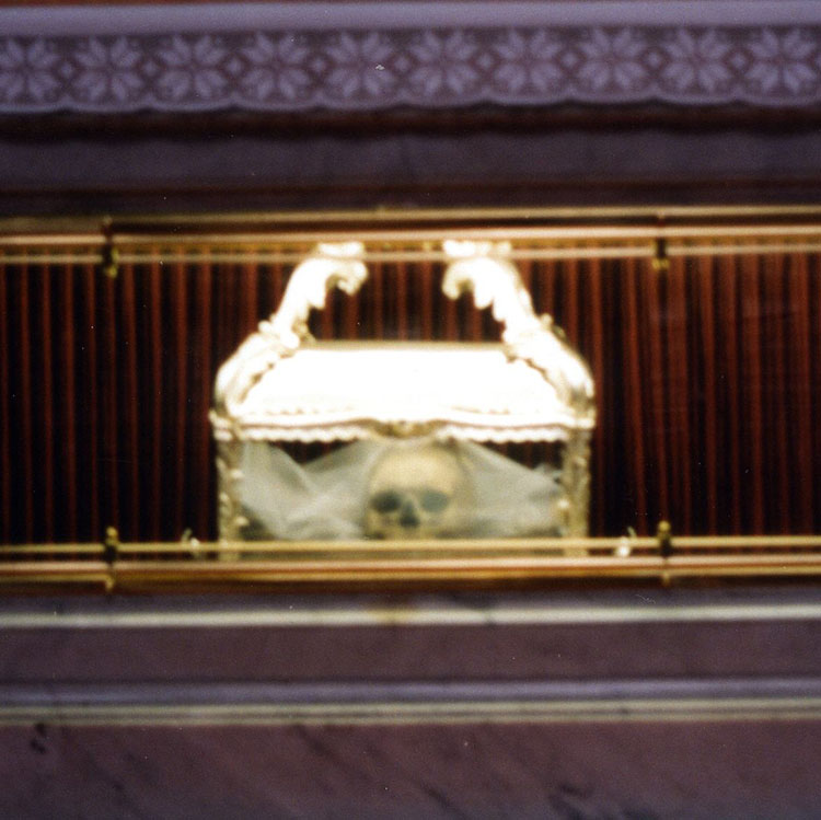 His skull is on display at the cathedral.