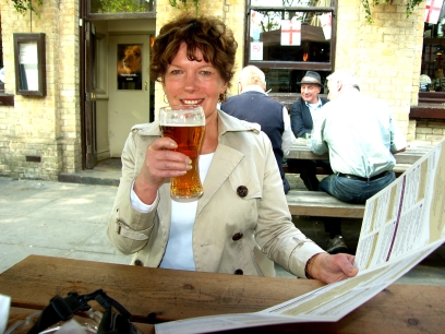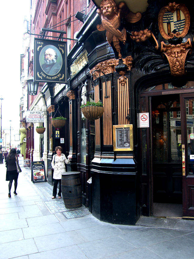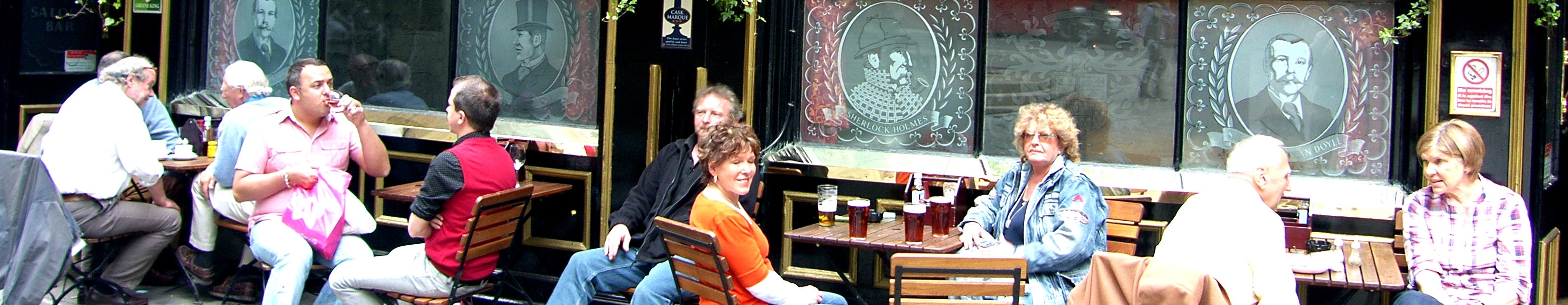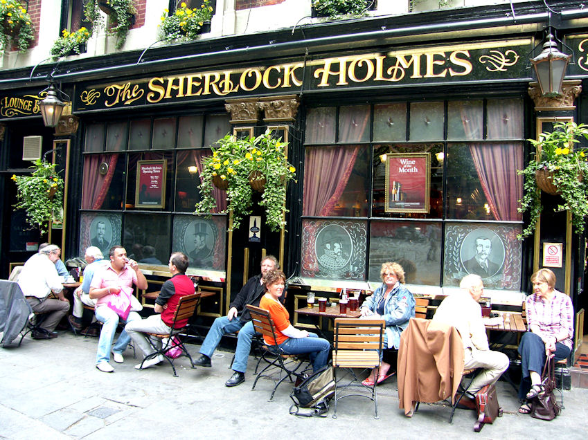 Tried to sit down and have a beer, but every outside table was taken. So we went looking for a pub where we could sit outside. Ended up at Charring Cross underground station, where Eija asked a flower vendor if there were any pubs nearby. We went to The Sherlock Holmes around the corner.