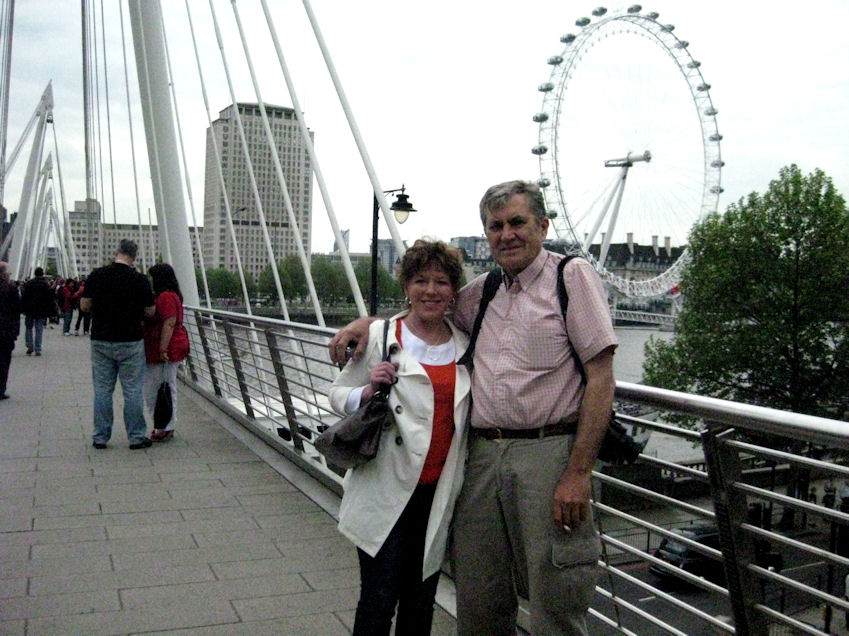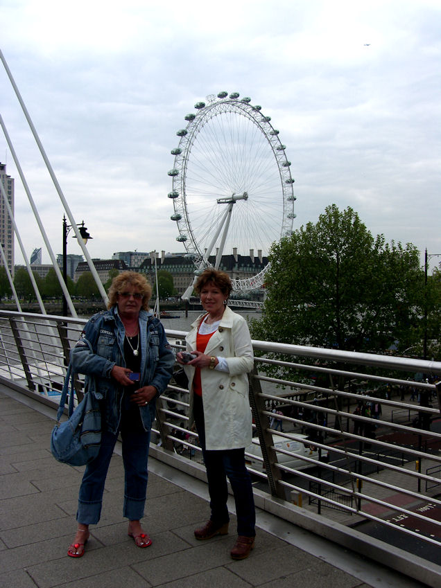 There was a table with a single man sitting with a half finished beer. With Eija and Rita starring at him, he felt uncomfortable enough, after a while, to offer to move. We asked him to stay and had an interesting conversation with him. After we finished our beers we started walking towards the Thames and crossed it on Hungerford bridge that crosses between the Westminster side and the London Eye.