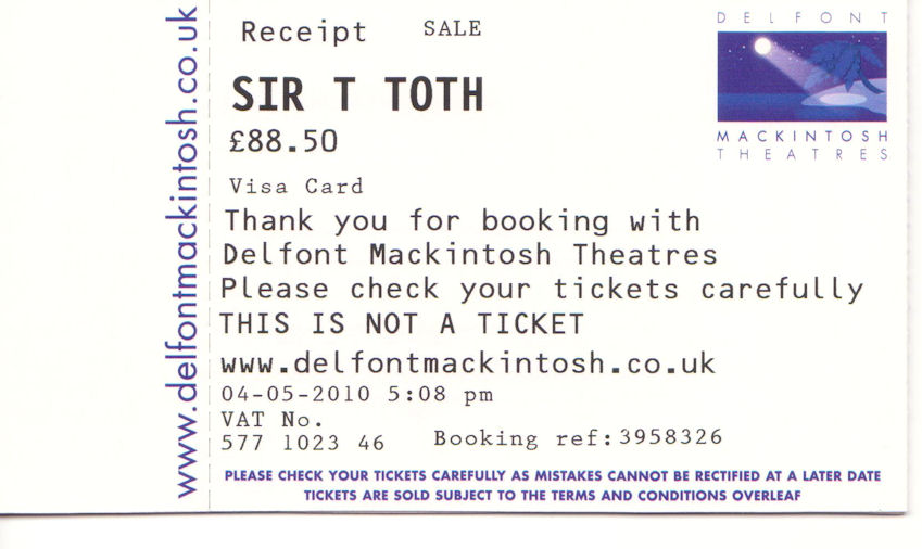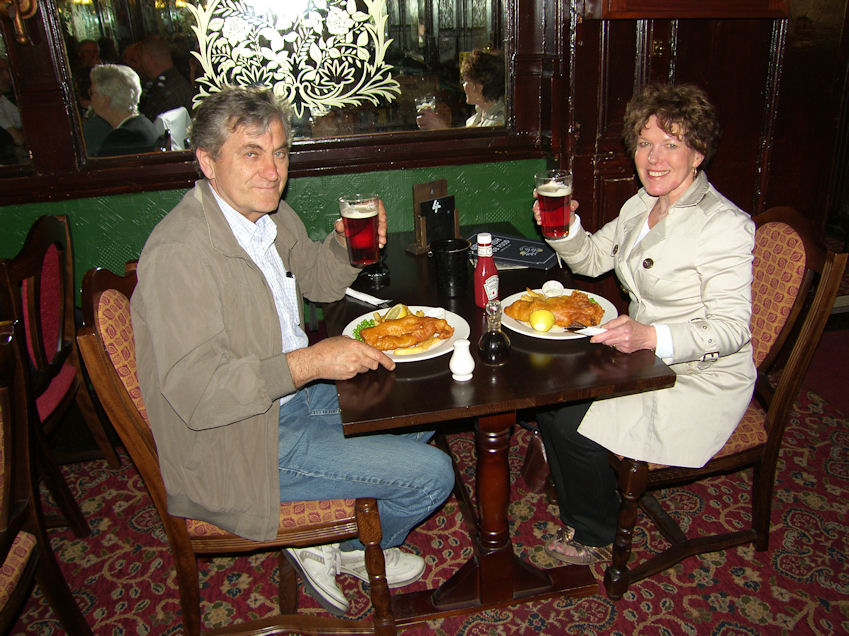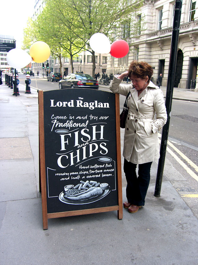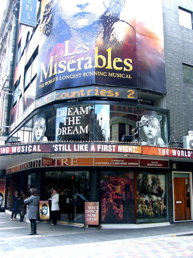 She felt much better and wanted to go to Sainsbury's in Cheam. She had e-mailed Sainsbury's to find out which stores sold Flax seed (I mentioned earlier). They e-mailed back, that the Cheam store had some in stock. Programmed the GPS and off we went. Ended up back at the same little convenience store we always end up at when we try to find Sainsbury's in Cheam. Asked a little old lady on the side of the street, and she gave us directions. Of course we didn't find it. Went for an extended drive and some of the road signs were to Kingston. Raija & Ken had stayed there, on a home exchange, some 20 years ago. We were considering it, but decided to head home instead. The weather is still lousy and we are told by the locals that it is unseasonably cold, for this time of year. YEAH, but it's not cold enough to keep Rita indoors, where she could run around barefooted. Wednesday May 12 Les Misérables Went on the 11:36 to Purley and transferred there to London Bridge. We could have waited for the 11:54 and gone non-stop, but figured we would save a few minutes. It turns out that the train arrives only about 5 min. earlier at London Bridge, and you have to transfer. We arrived at Piccadilly Circus around 1:00. The show at the Queen's Theatre was starting at 2:30. We walked through Chinatown, and with the help of the GPS found an English Pub, the Salisbury, that served Fish & Chips.