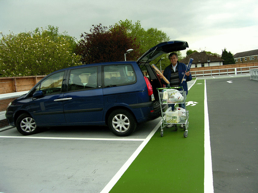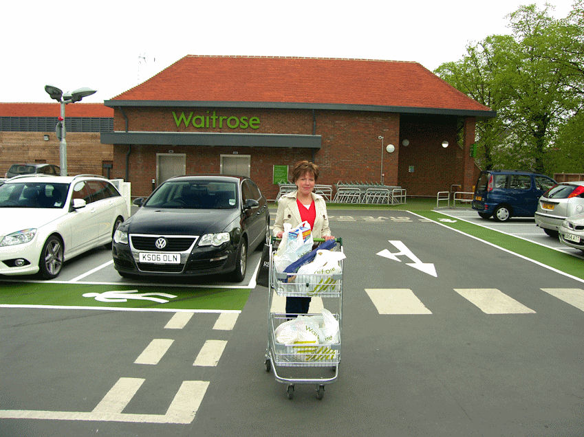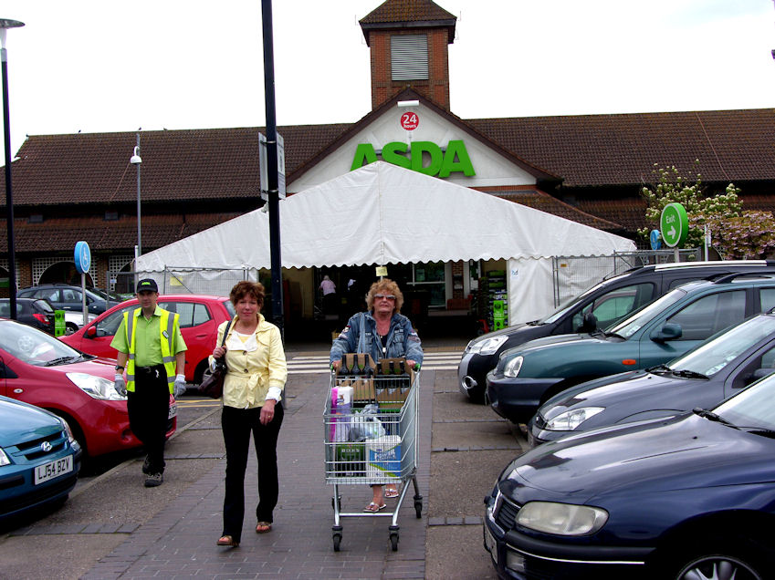 I reached for my GPS to find another Boots, but Rita and Eija were getting tired and just wanted to get home. We recrossed the river on Westminster Bridge, and took the underground back to London Bridge. Thursday May 20 Left the house around 10:00 and drove to Sainsbury's in Epsom. Pointed out Epsom Downs to Eija, but she was so concerned with her safety, that she missed it all together. She must have had her eyes closed in the back seat. Bought a whole bunch of groceries for Annika, Kaj, Sebastian and Christian's visit that starts tomorrow, and an adapter for Eija's computer for £2.29. From Epsom we drove through Cheam to Sutton to return the shoes Rita had just absolutely loved, at the time. Why did she returned it you ask, well, it's because she could. While they were returning the shoes, I bought a small fluorescent light to replace the one that has burned out in our bathroom, at Q&A. I bought the fluorescent light for £2.49 and saved paying the parking meter on the street which costs £3.40. Made Rita happy and saved some money also. I would call that a miracle. From Sutton we drove to Banstead and bought some groceries that you can only buy at Waitrose (ie. Hungarian Sausages and Hungarian Salami). On the way home we stopped at Asda which is approximately half way home. They have the cheapest wine, and we stocked up. By the way Eija did all the driving as you can see on the picture.