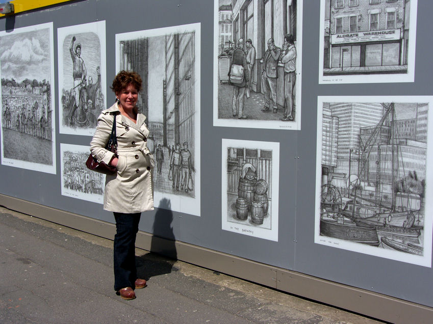 Lets see. By my calculation, that works out to about £75.00/ Baguette. Thursday May 6 Another typical Tadworth morning. Overcast, chilly, dull. I thought I should do something exciting today, so went out to where they pick the garbage up and brought the garbage can and recycling box back into the garage. Around ten the sun finally appeared, and we decided to go to the Tate Modern and see what everybody was raving about. The local we met at the The Bell (the local Pub) had raved about the Tate Modern. Eija on her visit to London, had bought a print there and has it hanging above her bed. So it must be a must see, when you come to London. We finally made it to the train station around 12:15, and caught the 12:24 to London Bridge. From there we walked to the Tate Modern, a 15-20 min. walk. Along the way, we passed by a wall with hundreds of pictures in charcoal.