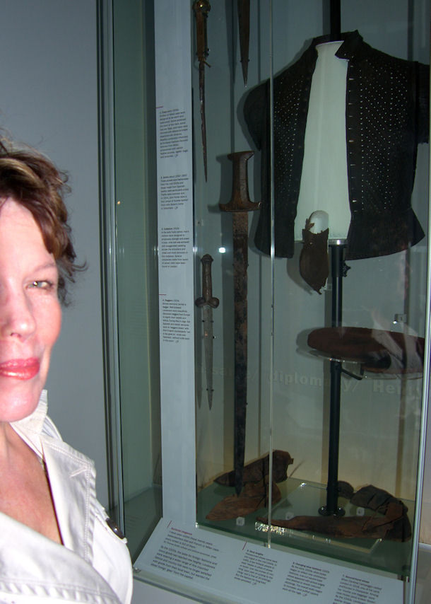 Here Rita is looking at men's clothing from the 15th century. Notice the male falsie (a codpiece). No wonder Rita's blushing. If you think false advertising is a modern invention, think again. Around 17:00 we started walking back to London Bridge. Walked by St. Paul's again.