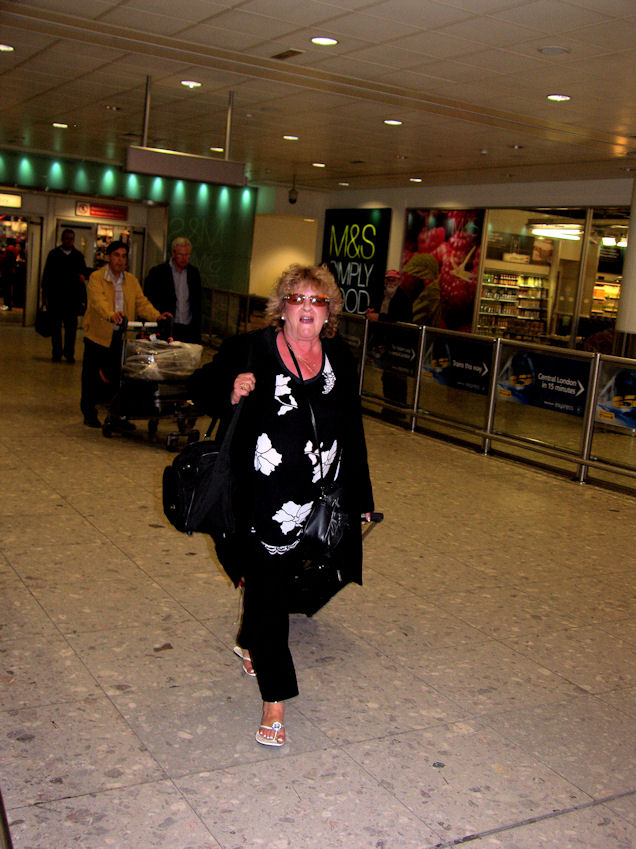 Had a beer at the Pub right beside the railway station, boarded the train and came home. On the train Rita was trying to find a discarded newspaper so she could read about the air traffic over southern England. She was worried about Eija's arrival tomorrow. Cooked up the steaks. They were about 3/8 of an inch thick and cost £11. Tuesday May 18 I am getting ready to go pick Eija up from Heathrow as I'm writing this. Checking Heathrow arrivals. Looks as if her flight is early arriving at 10:02 instead of 10:15. Hopefully I will make it. Rita is going to stay at the house and prepare for Eija (or is she trying to save her life?) . I will have her picture posted by the time you wake up. And here she is.