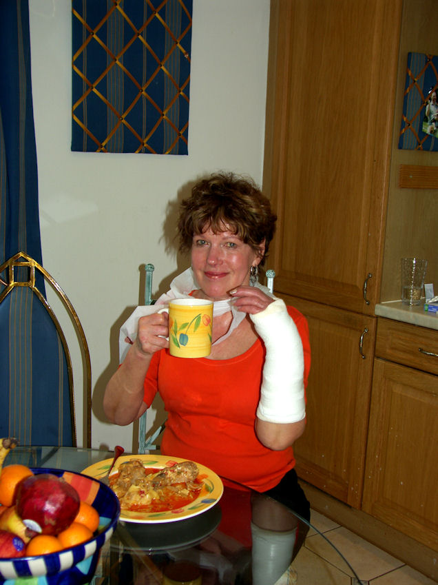 Cooked dinner had a few glasses of wine. Sebastian and Christian came back a few hours later. Sunday May 23 Terrible Day Rita made fresh coffee, and decided to bring the cafetiere into the dining room to pour some coffee into my cup. She has never brought it in before. Poured the coffee right beside my cup onto the table and it ran all over the white carpeting. Annika, Kaj and the boys left for the railway station at 9:30. They were planning to go to Greenwich to see the Cutty Sark, the Observatory and take a river cruise back to London Eye. Eija left just after 10:00. She is headed for Hampton Court. We were planning to townhop and shop for groceries in Purley. Started to walk to the train station at 11:05. I told Rita that I would walk ahead to buy the tickets so we wouldn't miss the 11:24. I was ahead about 10 yards when I heard this terrible scream behind me. Rita had fallen. She was wearing very stylish shoes and had her comfortable sandals in her purse. Walked back home put some frozen pees on her arm and started to look for hospitals in the neighbourhood. Told her to take a pain killer and lie down for a little while. Looked up a local hospital on the GPS and went to emergency shortly after 12:00. Took an x-ray. BROKEN WRIST. Tried to realign her wrist, put a cast on, took another x-ray. They were not happy with the realignment, so we will have to go back to the hospital and see a specialist Tuesday morning. We were home at 5:10. None of the visitors had arrived home yet.