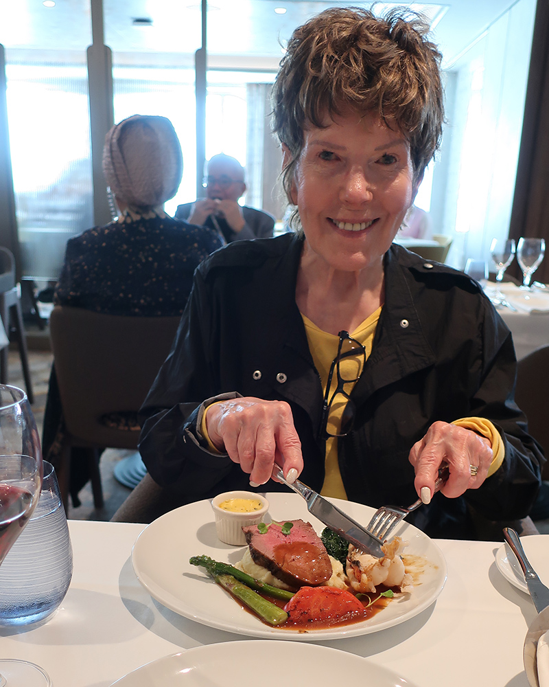 Had steak and lobster and shrimp with a glass of